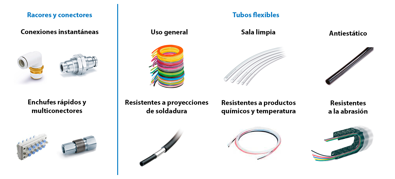 Los conectores neumáticos conectan las redes principales de generación de aire comprimido con los puntos de utilización de la aplicación.