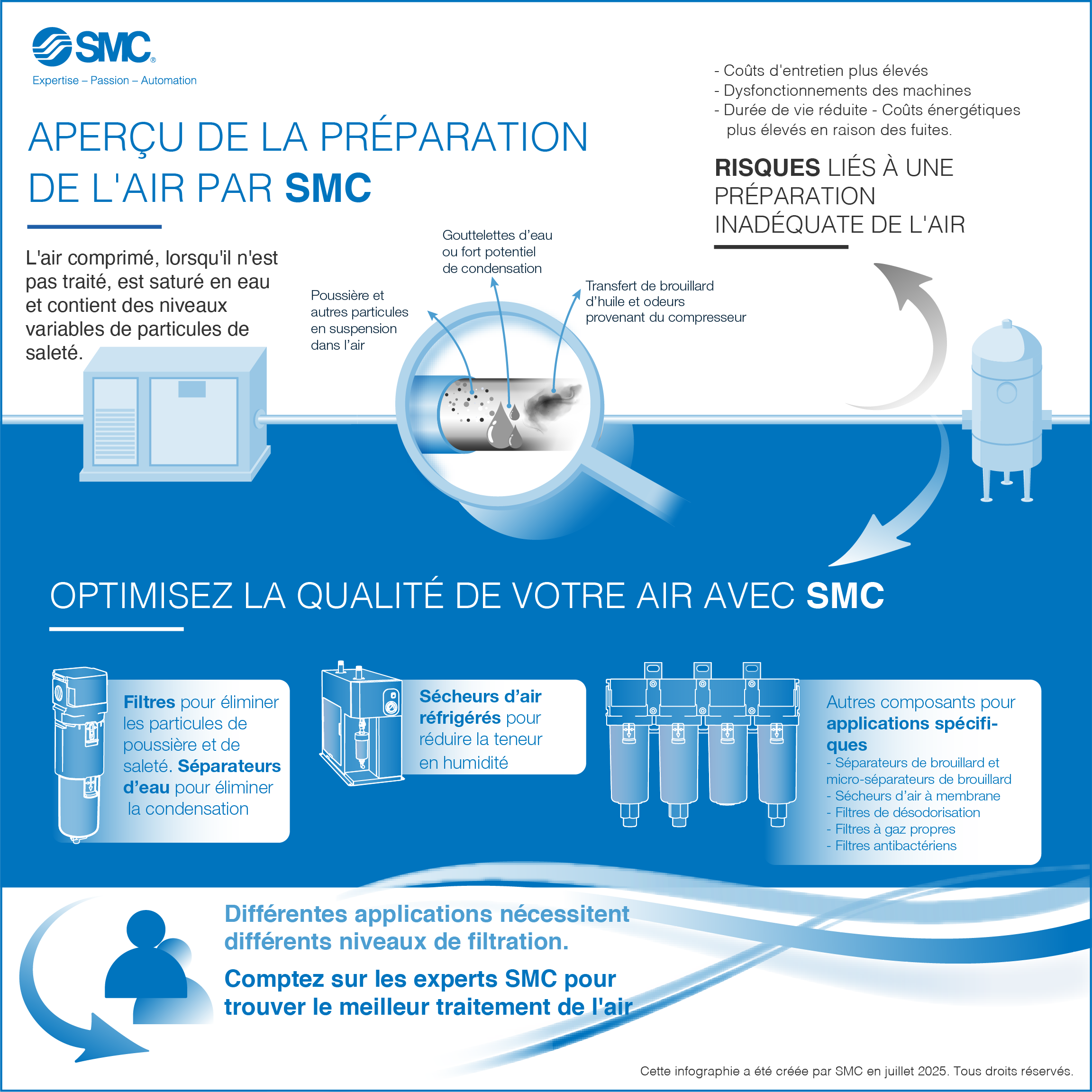 Pour conclure, il est un fait que l'air rejeté par le compresseur contient des impuretés. Si l'air n'est pas traité en fonction des besoins de votre processus, ces impuretés finiront par contaminer le produit final. Différentes applications nécessitent différents niveaux de filtration et de traitement global de l'air. Comptez sur SMC Experts pour trouver le meilleur traitement de l'air pour votre système d'air comprimé.