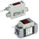 SMC offers a variety of digital flow switches. Series PF2A for air, PF2W for water, PF2D for deionized water and chemicals. Flow rate setting and monitoring are possible with the digital display. Integrated and remote type displays are available for different types of application. Water resistant construction is used conforming to IP65 protection. Switching from real-time flow rate to accumulated flow is possible.